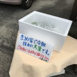 何かを思いついたらしい。 おばあさんとスタッフが二人でこそこそと何やらやっていると思ったら。 庭の大葉を摘んで、袋詰めしていると思ったら。 まめ家の駐車場の道路のこんなものが設置されていたんです。
